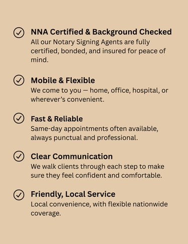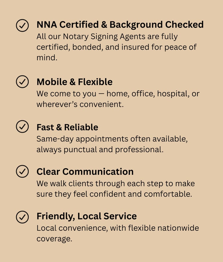 ✅ Trusted Professionals: Every notary in our network is vetted, experienced, and committed to accuracy and professionalism.